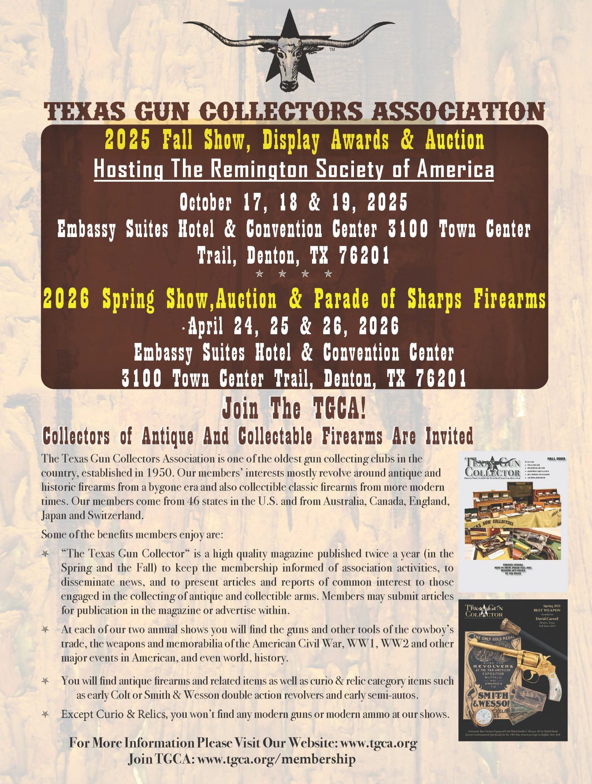 It includes 360 pages of the finest collectible weapons on the planet. It is now available in a soft cover version and a hard bound, deluxe version. All members of the TGCA receive a complimentary, soft cover copy of the new Annual. Join the Texas Gun Collectors Association today and get your complimentary copy.